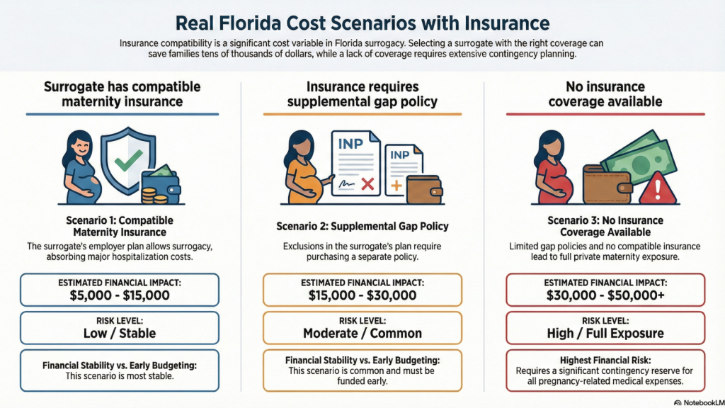 Surrogacy in Florida typically costs between 110,000 and 200,000 dollars, but insurance compatibility can change total expenses by 15,000 to 40,000 dollars or more. The surrogate’s maternity insurance is one of the biggest financial swing factors in the entire journey.